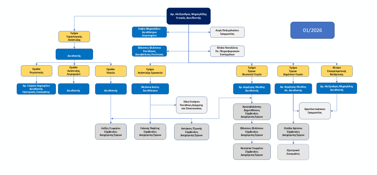 Τα έξι τμήματα εξειδικεύονται σε συγκεκριμένα επιστημονικά και διοικητικά αντικείμενα και είναι στελεχωμένα με προσωπικό το οποίο κατέχει ακαδημαϊκές γνώσεις, εμπειρίες και διαχειρίζεται το εταιρικό δίκτυο συνεργατών καλύπτοντας έτσι με τον καλύτερο δυνατό τρόπο τη θεματική περιοχή του Τμήματος.