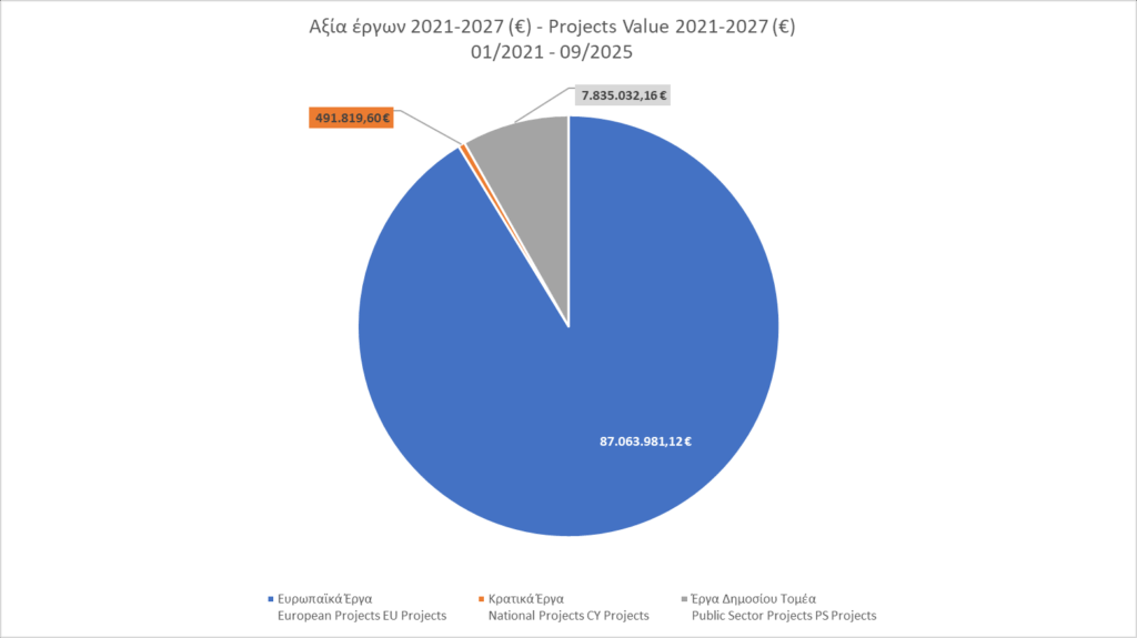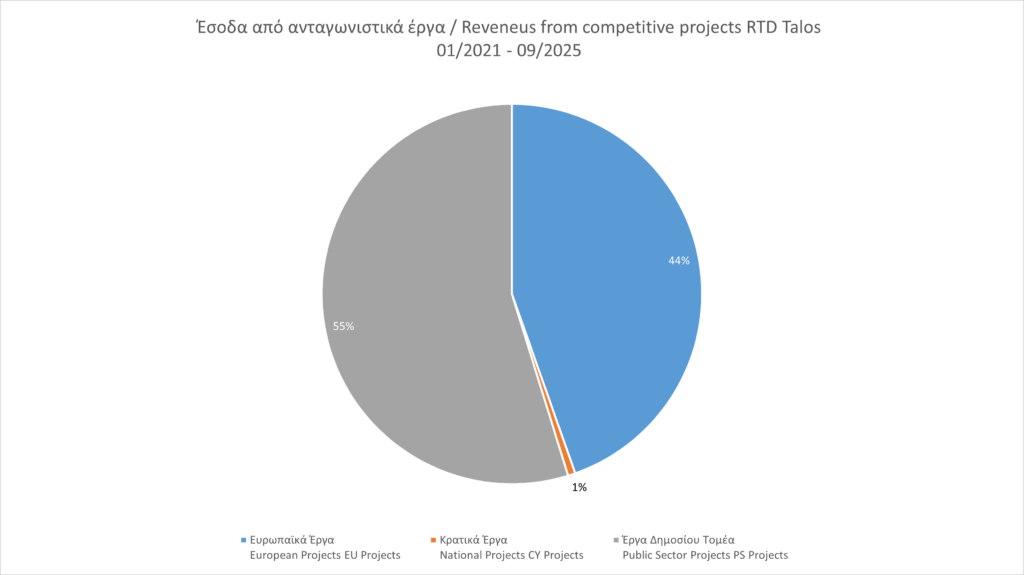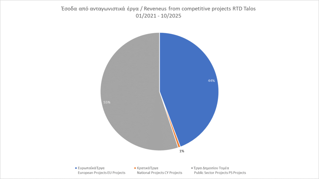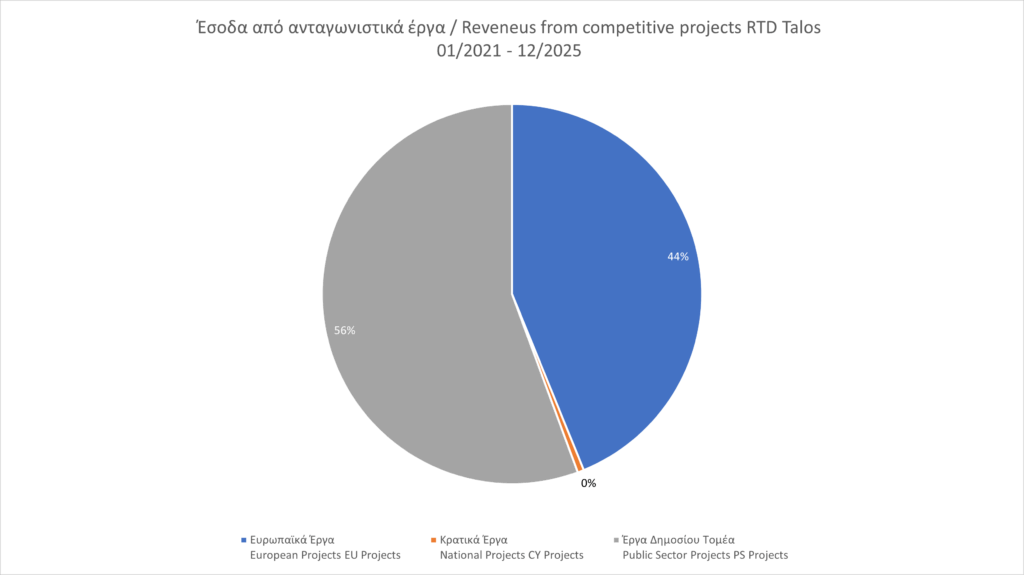 Στο διάγραμμα παρουσιάζονται η αξία των συμβολαίων των έργων που υλοποίησε ή υλοποιεί  ο Αναπτυξιακός Οργανισμός RTD Talos κάτω από Ευρωπαϊκά Προγράμματα (Έργα EU), Κρατικά Προγράμματα (Έργα CY) και Διαγωνισμούς του Δημοσίου (Έργα ΔΤ) την περίοδο 2021-2027