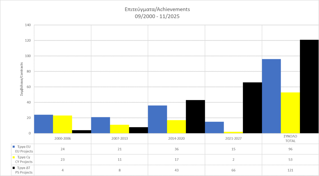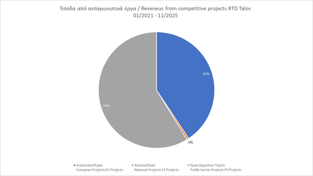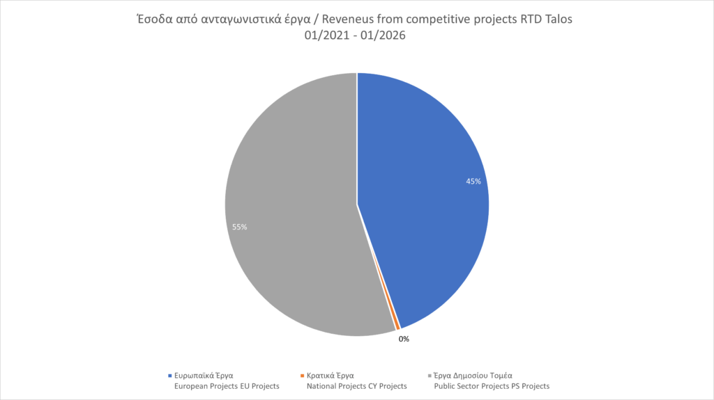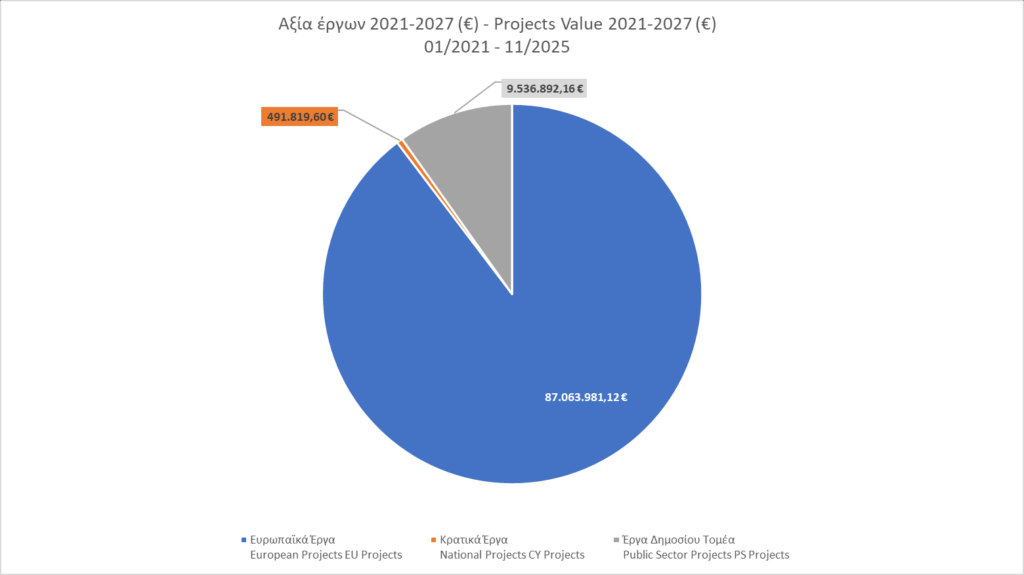 The diagram shows the value of the contracts of the projects implemented by the RTD Talos Development Organization under European Programs (EU Projects), State Programs (CY Projects) and Public Tenders (Public Sector Projects) in the period 2021-2027